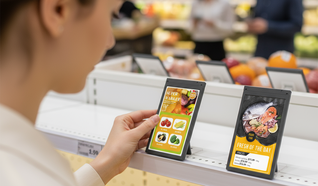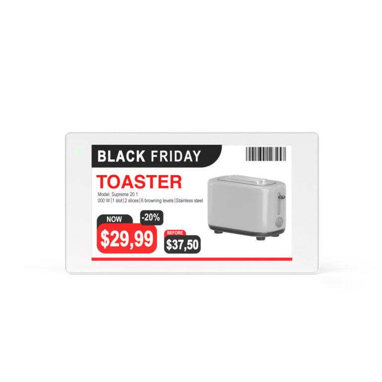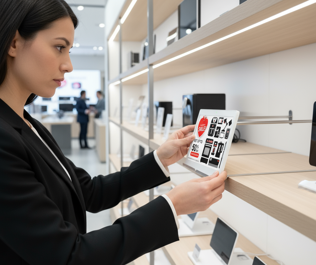 An ESL, or Electronic Shelf Label, is a digital display that replaces traditional paper tags. It updates prices, product information, and messages in real time — directly synchronized with your systems.